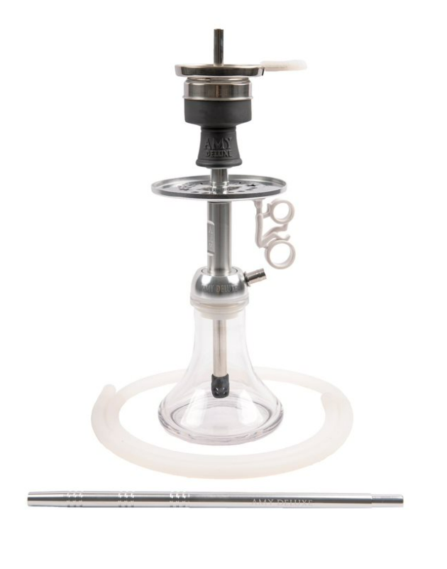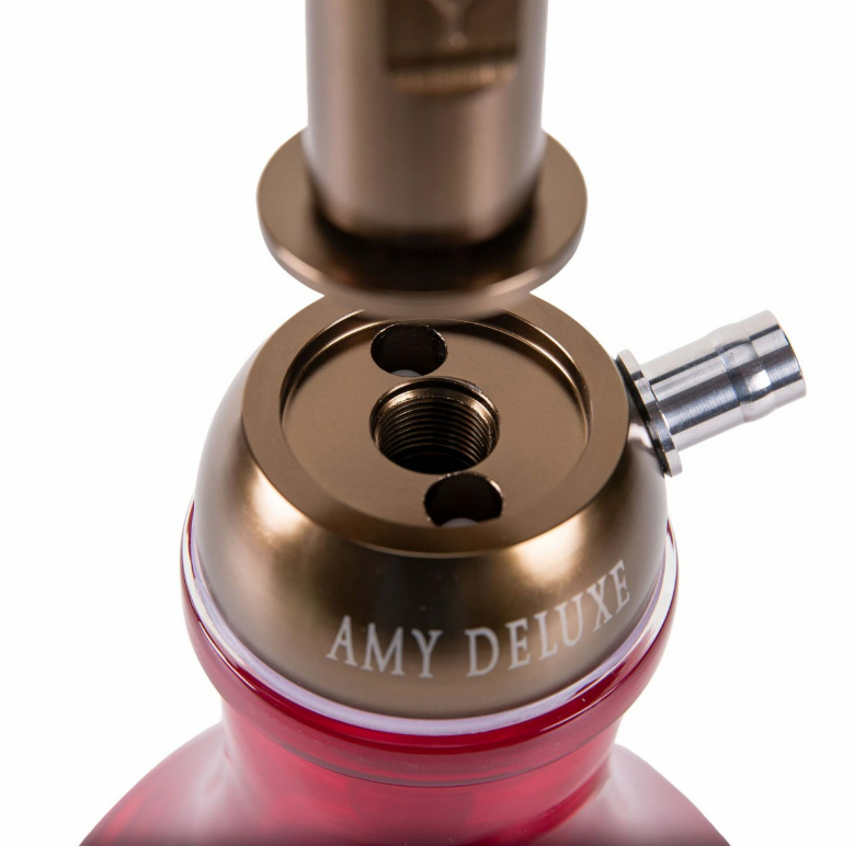 Dit model heeft een klemsluiting. De sluiting van de waterpijp stang op de vaas gaat simpelweg door de stang in je vaas te drukken en door de stevige rubberen afdichting zal je vaas klemmen wat een stevige en luchtdichte afsluiting geeft. De 116.03 Amy Deluxe wordt compleet geleverd met as schaaltje, zwarte stenen tabakskop met hot screen, warmte schild, slanghouder en een siliconen waterpijpslang. Bij de slang wordt ook een prachtige roestvrij stalen (RVS) mondstuk geleverd.